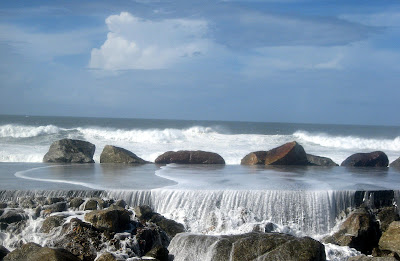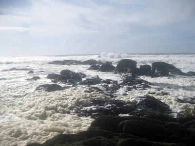 Nesse dia, o mar todo ele era espuma, embatendo furiosamente contra o paredão. A determinada altura, não falta o aviso. Existe ali uma placa que proíbe a passagem devido ao perigo da rebentação. Dois pescadores mais avisados contornaram as rochas, pelo lado esquerdo, evitaram o ponto de rebentação maior e seguiram para os seus pontos de pesca. Um homem jovem parecia brincar com o vaivém perigoso das vagas, deixando-se propositadamente encharcar, num duelo quase suicida com as ondas cada vez maiores. Mais tarde, apercebi-me que o mar já cavara um fosso nas pedras, do lado da cidade e que estar ali seria sempre pura teimosia.
