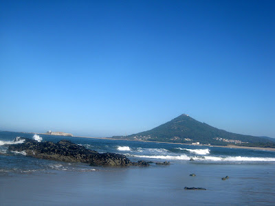 A Praia de Moledo, mais as suas moradias de veraneio, espraia-se até à foz, até ao fim, emoldurada pela Fortaleza da Ínsua e pelo Monte de Santa Tecla. Já na Mata do Camarido, entre os pinheiros, ouço os espanhóis a chegar, os mesmos que mais tarde encherão à hora de almoço a praça junto à Torre do Relógio, em Caminha: “Moledo, es una playa mui preciosa…”